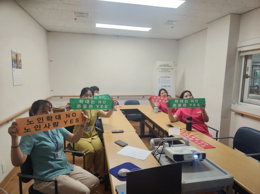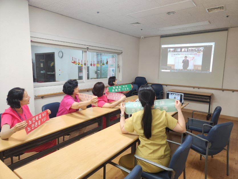 2024년 6월 11일 한국노인복지중앙회에서 주관하는 「2024년 노인인권 및 노인학대 예방 결의대회」행사를 줌화면 온라인으로 종사자들 모여서 노인학대NO, 노인존중 YES 플랜카드를 들고 결의대회 행사를 참여하였습니다.